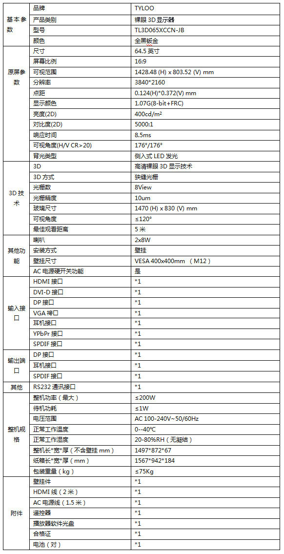 TL3D065XCCN-JB裸眼3D顯示器(qì)産品規格書(shū)